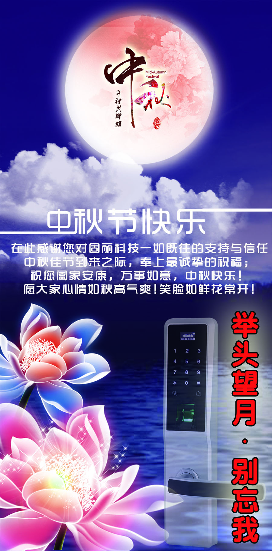尊敬的客戶:感謝您對固麗科技長期以來的支持和厚愛,月到中秋分外明,又是一年團圓日。在這中秋月圓之際,在這親朋團圓之日,我公司為您送上誠摯的祝福,祝您身體健康,事業(yè)興旺,笑臉相伴,生意興隆,中秋月圓,美夢成真!祝您及您的家人中秋快樂,幸福美滿!
